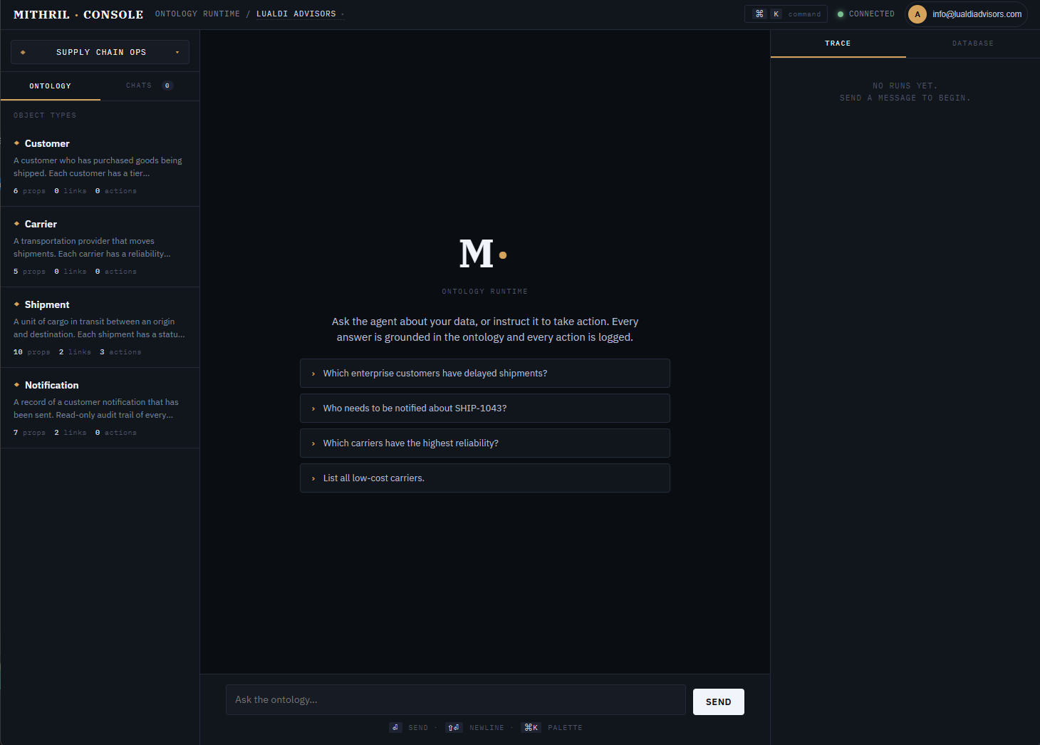 Mithril turns your enterprise data into a structured world that frontier models can reason over, cite, and act upon, with human approval on every write. Built for how operators actually deploy AI.